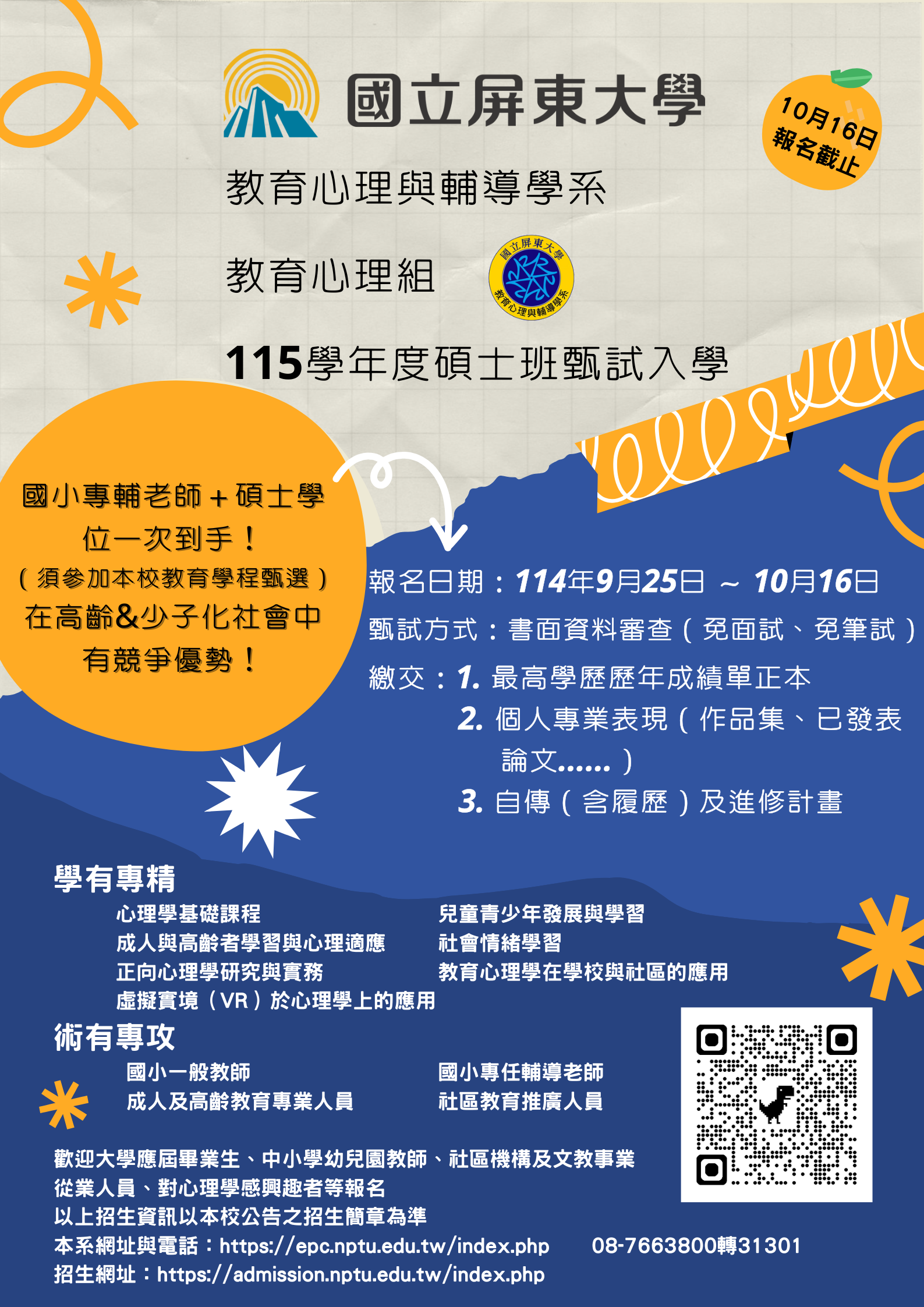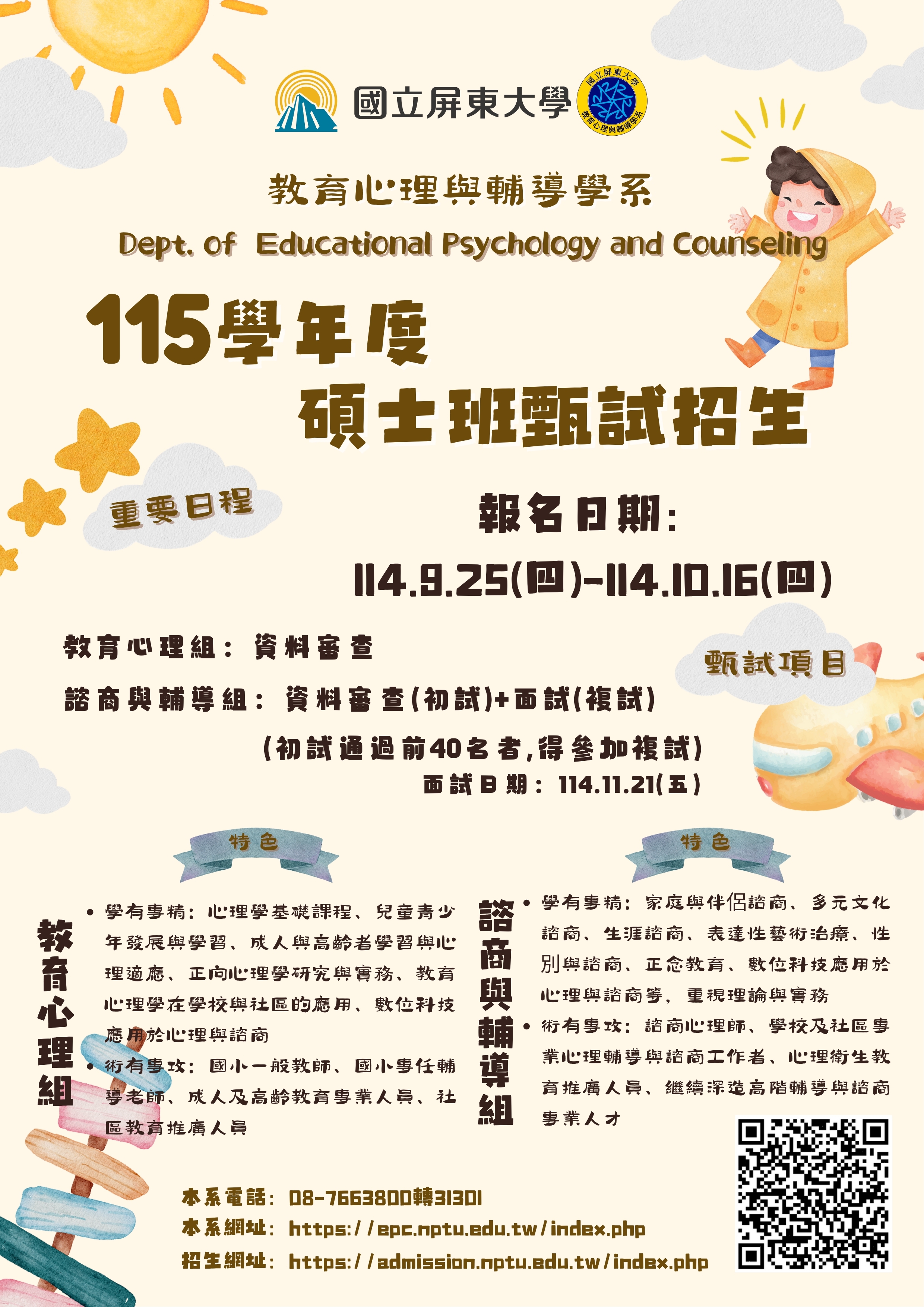 【招生公告】115學年度教育心理與輔導學系碩士班甄試~招生中~!!