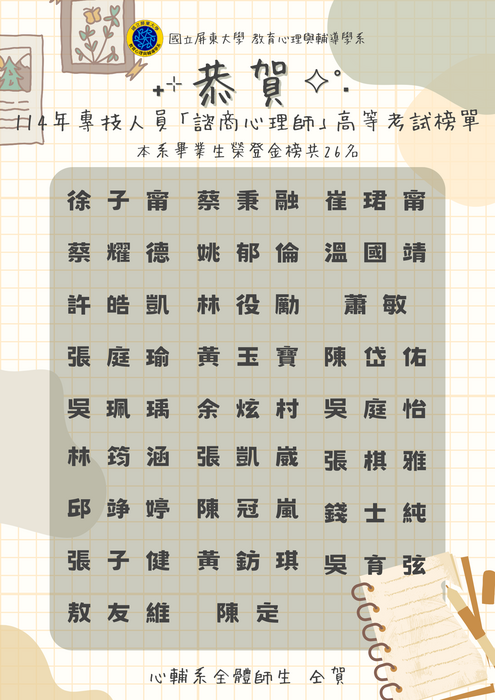 【恭賀】114年度教育心理與輔導學系 畢業校友通過心理師考試榜單