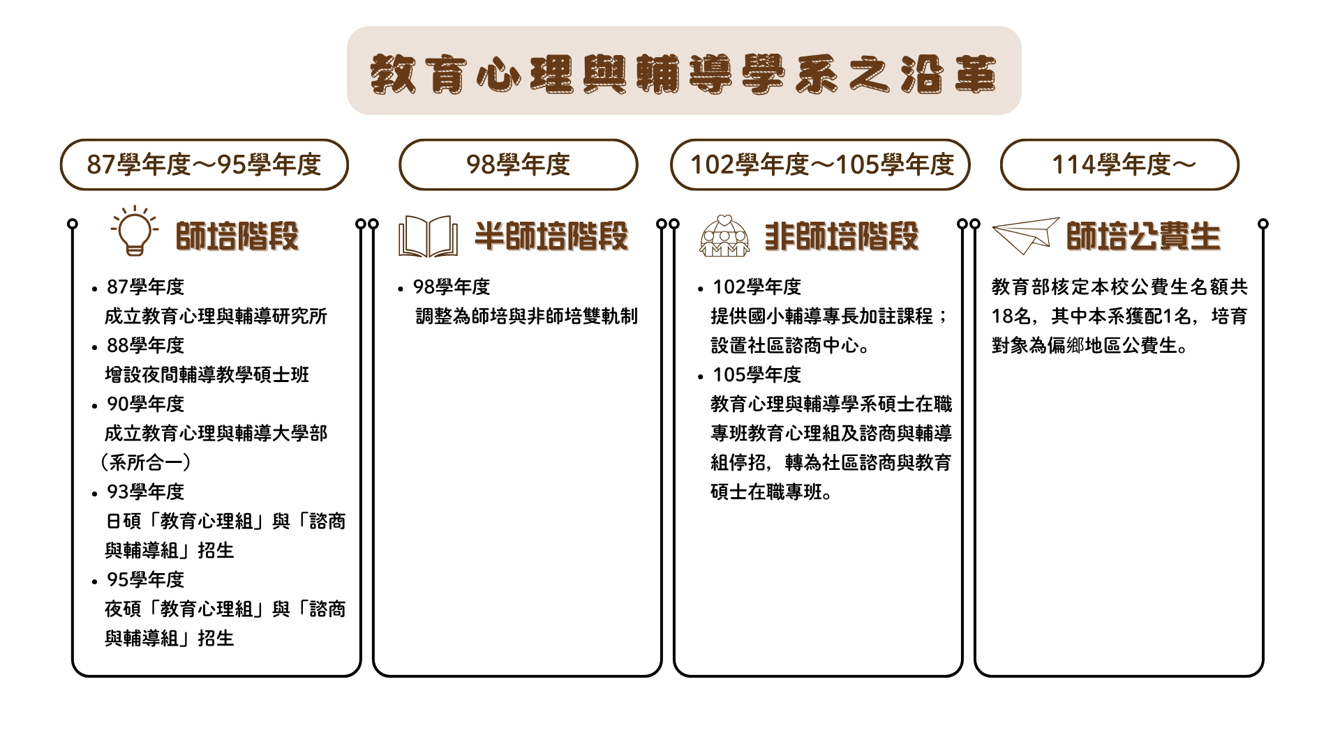 回顧本系的發展,從師培,走向半師培,再走向非師培;從培育學校教師,擴及至培育社區專業、半專業助人與教育工作者;服務的對象,也從兒童與青少年,擴及至成人及高齡者;服務的群體,更從學生,擴及至不同族群,以落實本系及本校核心的在地化理念,並善盡大學培育人才的社會責任。